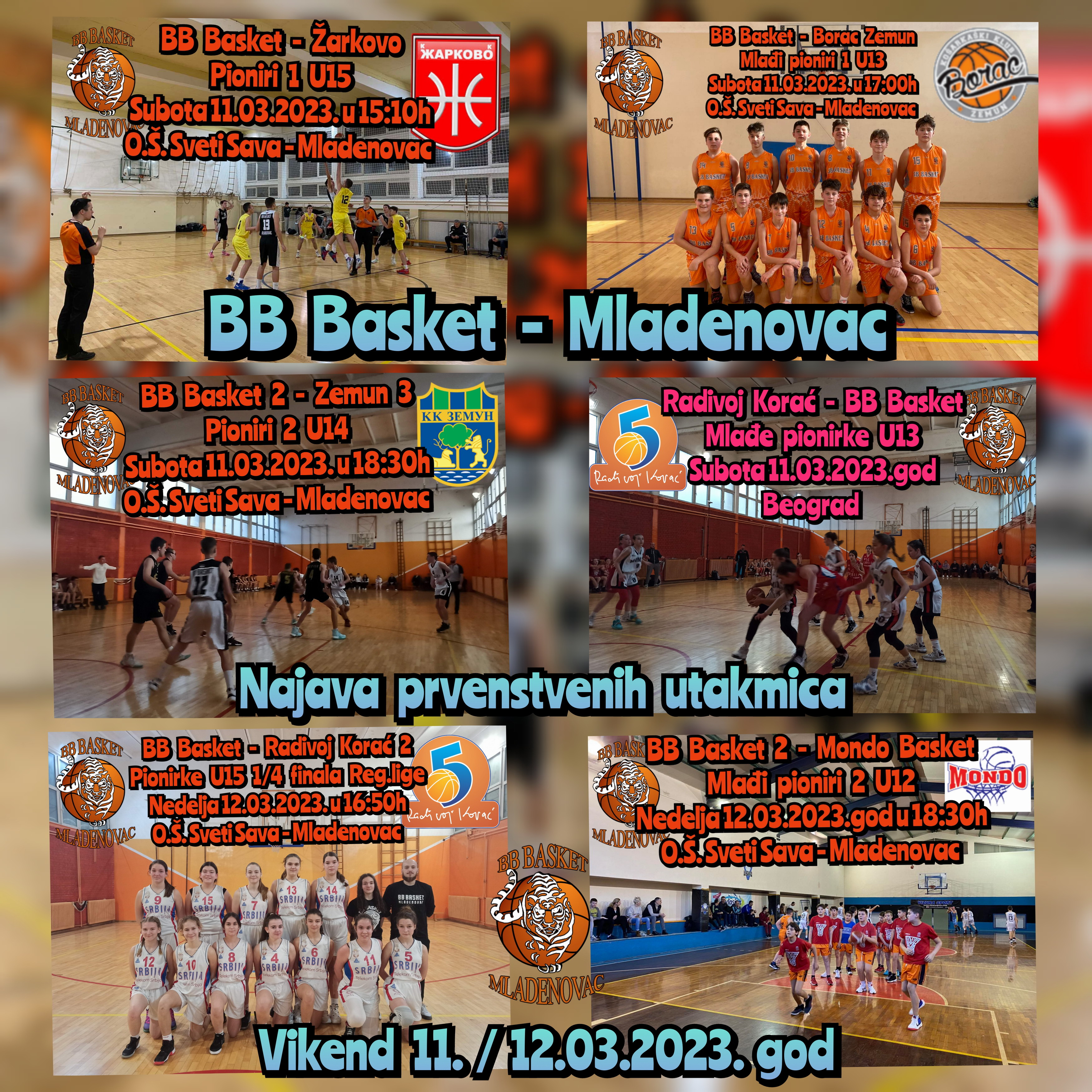 U 12. kolu regionalne lige, grupa 4, naša druga selekcija mlađih pionira igra utakmicu sa ekipom K.K. Mondo Basket iz Batajnice. Utakmica se igra u nedelju 12.03.2023. godine u Mladenovcu u sali O.Š. Sveti Sava sa početkom u 18:30h. Poziv svim navijačima i simpatizerima kluba da fer i korektnim navijanjem podrže naše dečake.